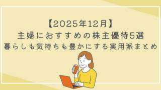 株主優待レビュー&楽しみ方 【2025年12月】主婦におすすめの株主優待5選|暮らしも気持ちも豊かにする実用派まとめ 年末にうれしい株主優待を主婦目線で厳選!すかいらーく・千趣会・ミルボン・ヒューリック・ライオンなど、暮らしに役立つ実用派優待を紹介。節約にも、ごほうびにもなる12月のおすすめ銘柄をわかりやすく解説します。 2025.11.26 株主優待レビュー&楽しみ方